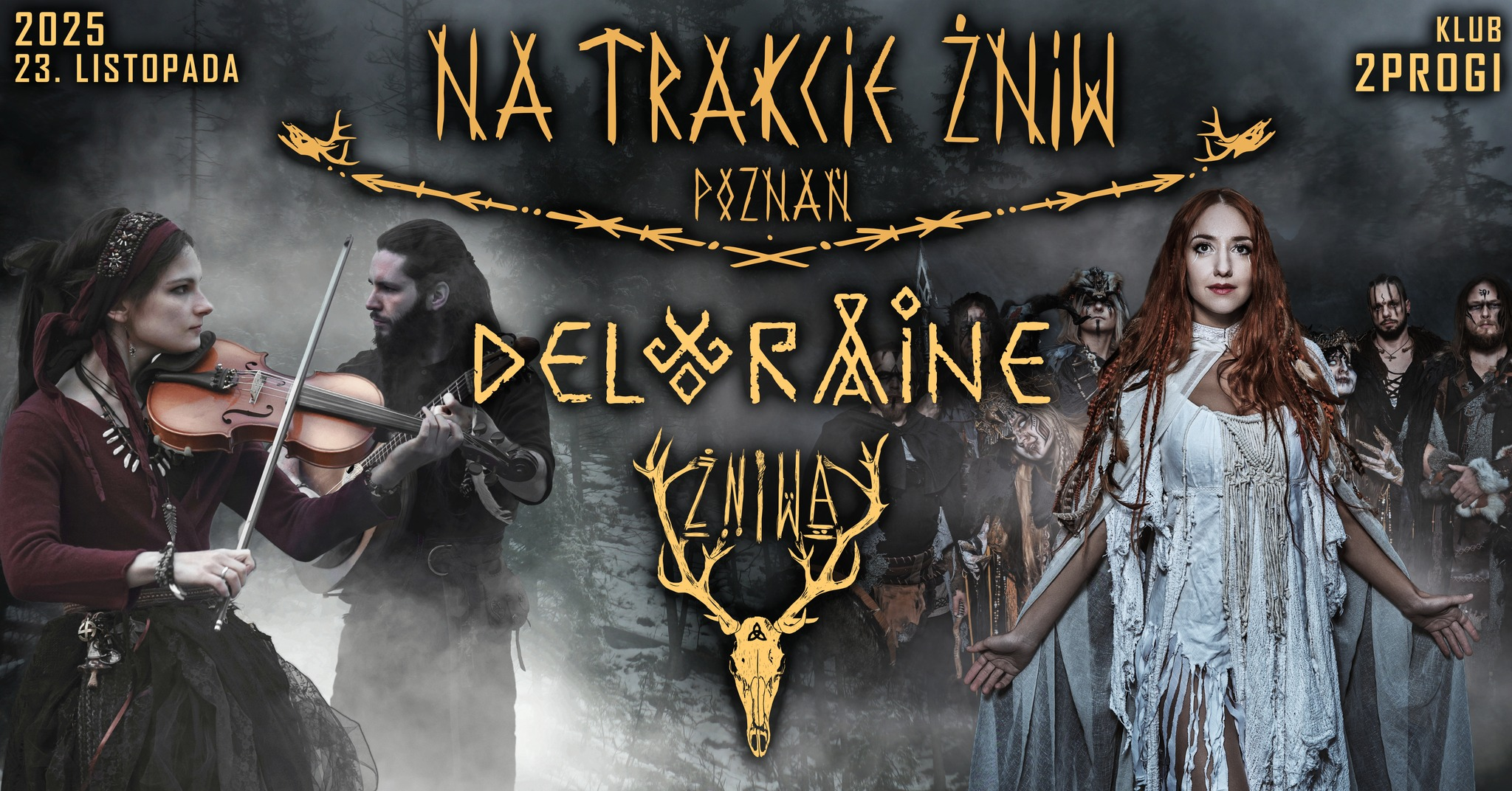 Deloraine mistrzowsko splatają potężne wokale charyzmatycznych wokalistów z bogatym brzmieniem szerokiej gamy etnicznych i egzotycznych instrumentów. To nie tylko koncert – ich show łączy rytuał i muzykę, zabierając słuchaczy w epicką podróż do światów inspirowanych fantastyką, mitologią celtycką, nordyckimi sagami i dawnymi słowiańskimi legendami. Koncerty Deloraine są znane z porywającej atmosfery i widowiskowości. Tym razem pojawią się w Polsce z zupełnie nowym show! Czekają na Ciebie pogańskie tańce, tajemnicze rytuały, wyjątkowe kostiumy oraz mitologiczne postacie ożywające na scenie – rogate wiedźmy, bóg Cernunnos czy sam Odyn. Ich występy to niekończący się strumień energii, który podbił publiczność na największych europejskich festiwalach i klubach.