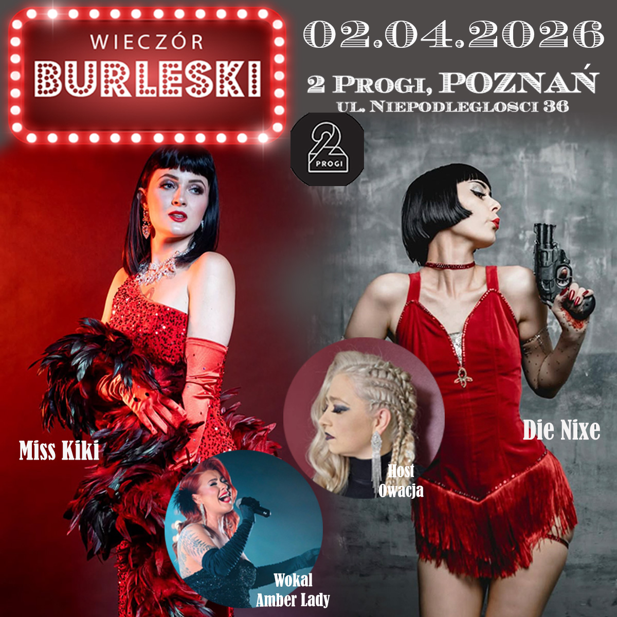 Brokat pióra i cekiny tym razem w mniej oczywistej, undergroundowej oprawie rodem z czasów prohibicji. Przenieście się w ten klimat prosto do Klubu 2Progi na fantastyczny spektakl, podczas którego zobaczycie niesamowite artystki.